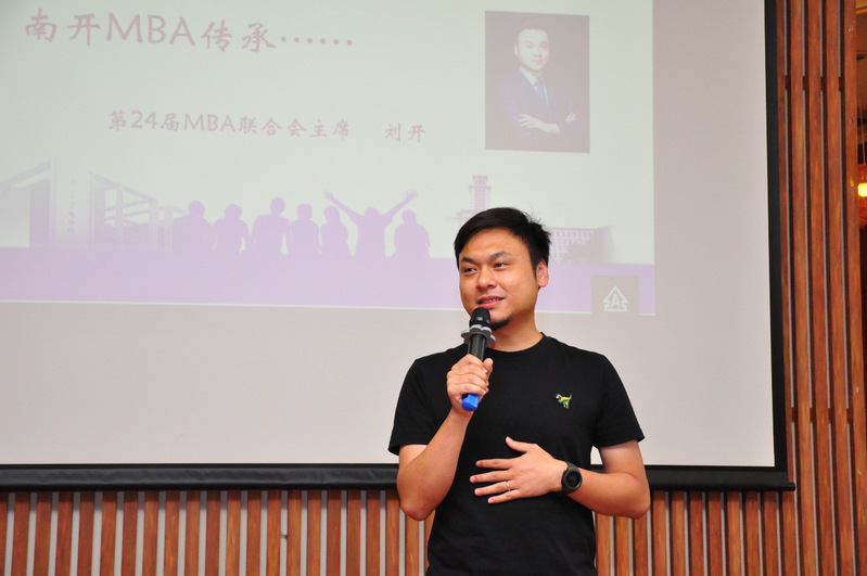 南开大学第24届MBA联合会主席刘开代表所有在校生欢迎2012级MBA校友返校并分别从学术、体育和品牌提升三方面汇报了联合会的情况。