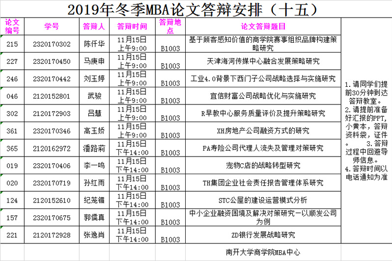 南开大学MBA中心2019年冬季答辩安排(十五)