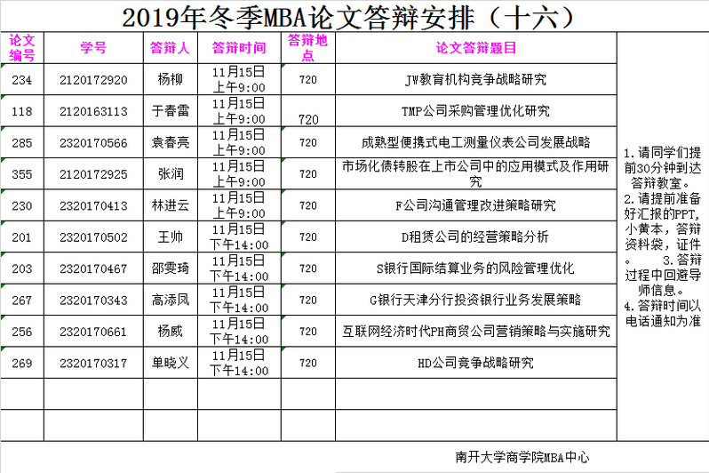 南开大学MBA中心2019年冬季答辩安排(十六)