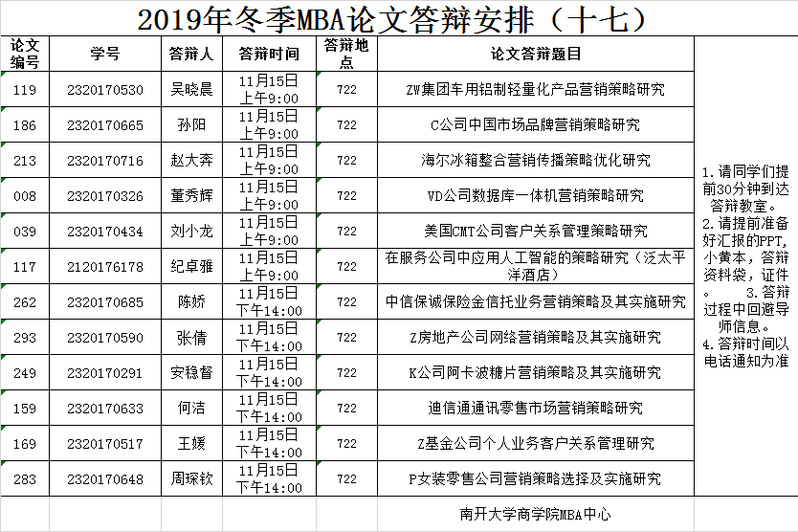 南开大学MBA中心2019年冬季答辩安排(十七)