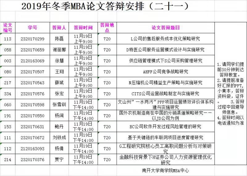 南开大学MBA中心2019年冬季答辩安排(二十一)