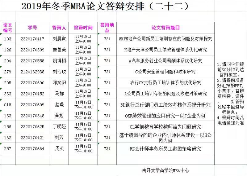 南开大学MBA中心2019年冬季答辩安排(二十二)