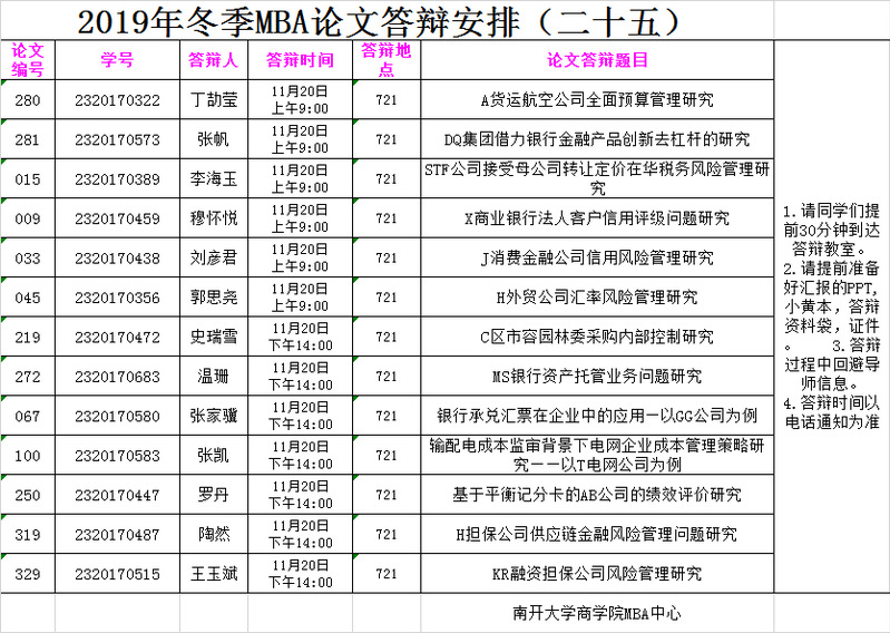 南开大学MBA中心2019年冬季答辩安排(二十五)