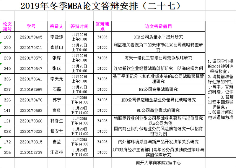 南开大学MBA中心2019年冬季答辩安排(二十七)