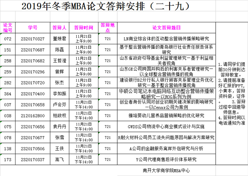 南开大学MBA中心2019年冬季答辩安排(二十九)